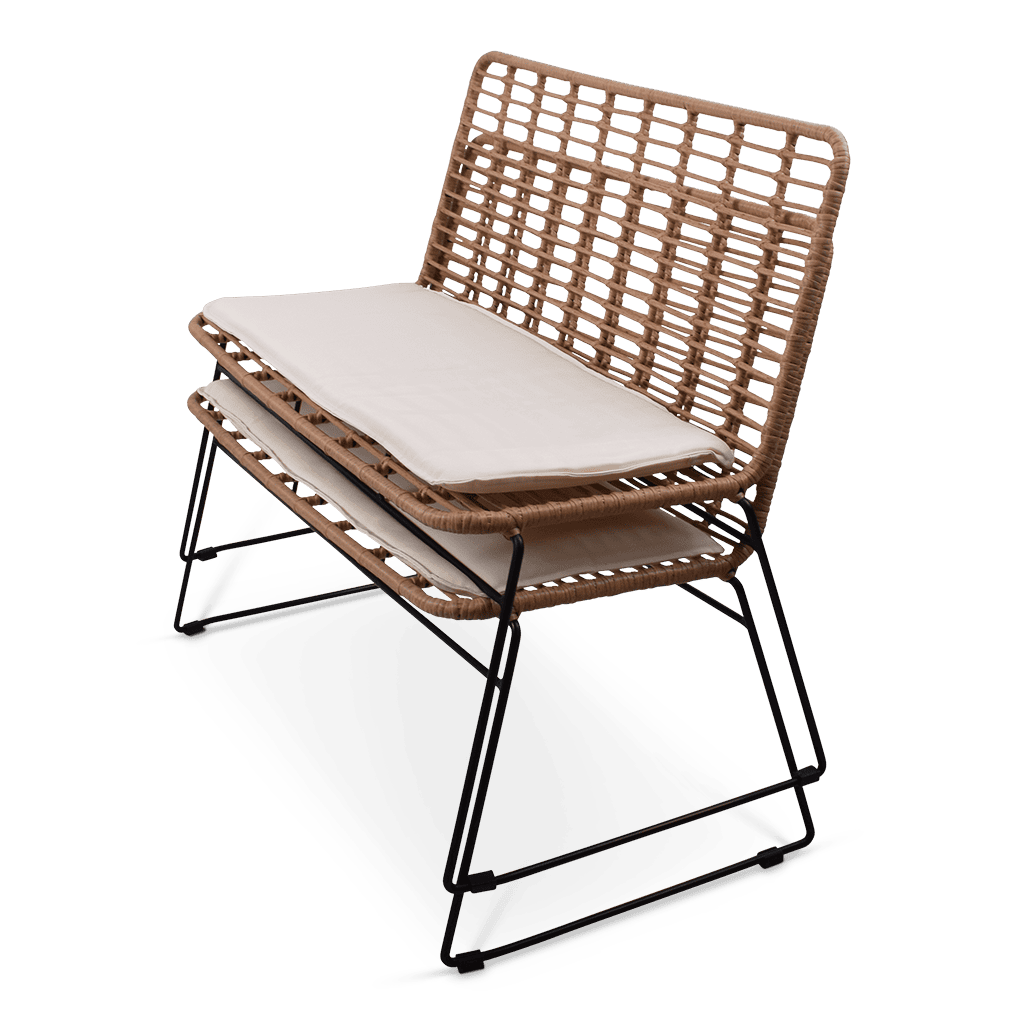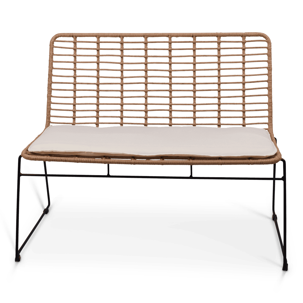De rotan bank is gemaakt van PE rattan wat wordt gekenmerkt door zijn realistische uitstraling van natuurlijk rotan. PE rotan is een door de mens gemaakt materiaal wat o.a wordt gebruikt voor tuinmeubilair. Zo kan deze bank dus het hele jaar zorgeloos buiten blijven staan.